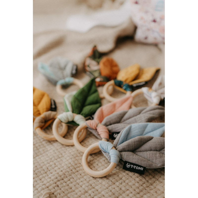 Dřevěná kousátka T-TOMI vznikla spojením dvou materiálů, dřeva a látky. Roztomilé, ale přitom funkční hračky, které Vaše miminko nejen nadchnou, ale stanou se i skvělým pomocníkem při bolestivém prořezávání zoubků. Jsou přirozenou alternativou plastových kousátek. Při hraní s dřevěným kroužkem si děti také procvičí jemnou motoriku. Jemný mušelín v BIO kvalitě přímo vybízí k „poňufání“.